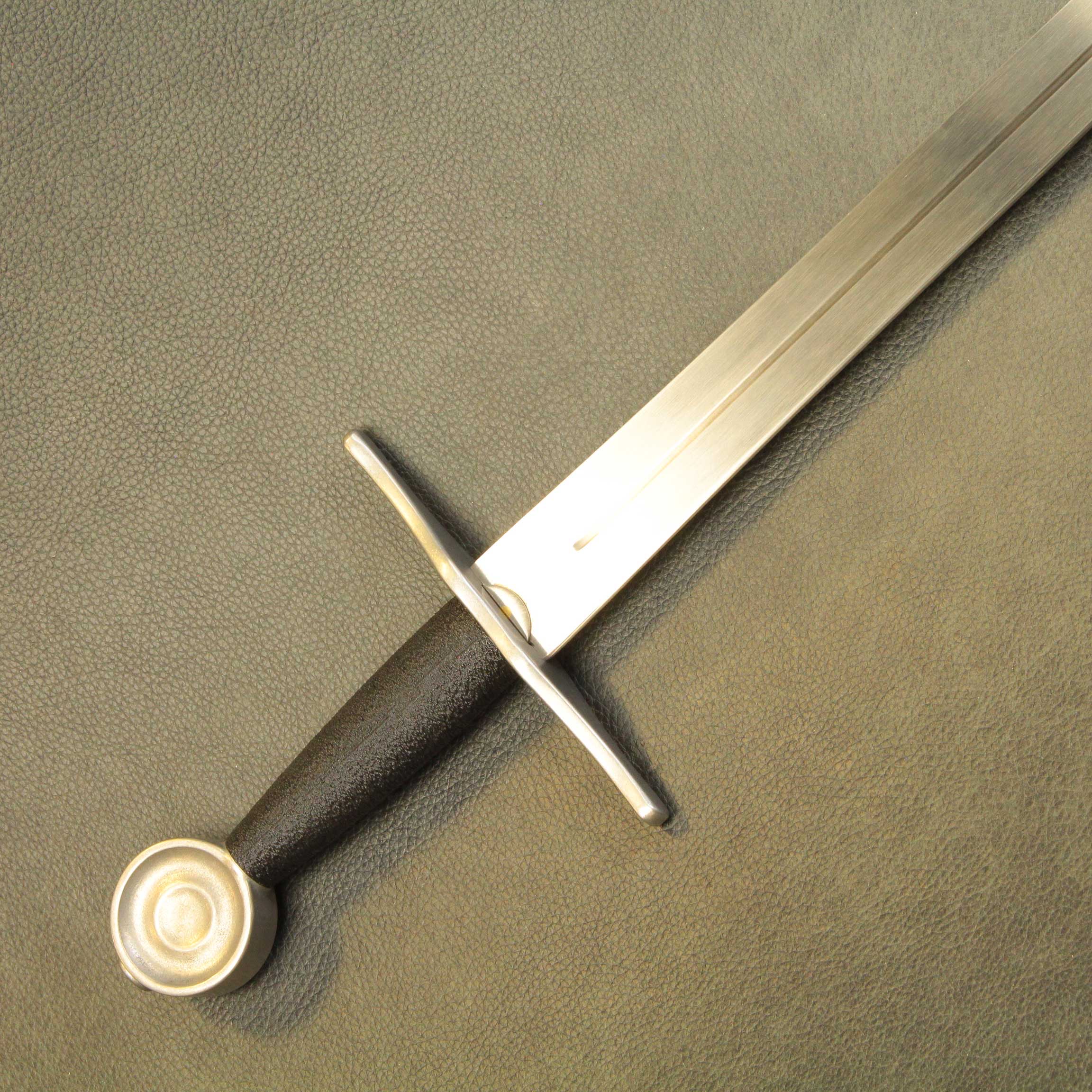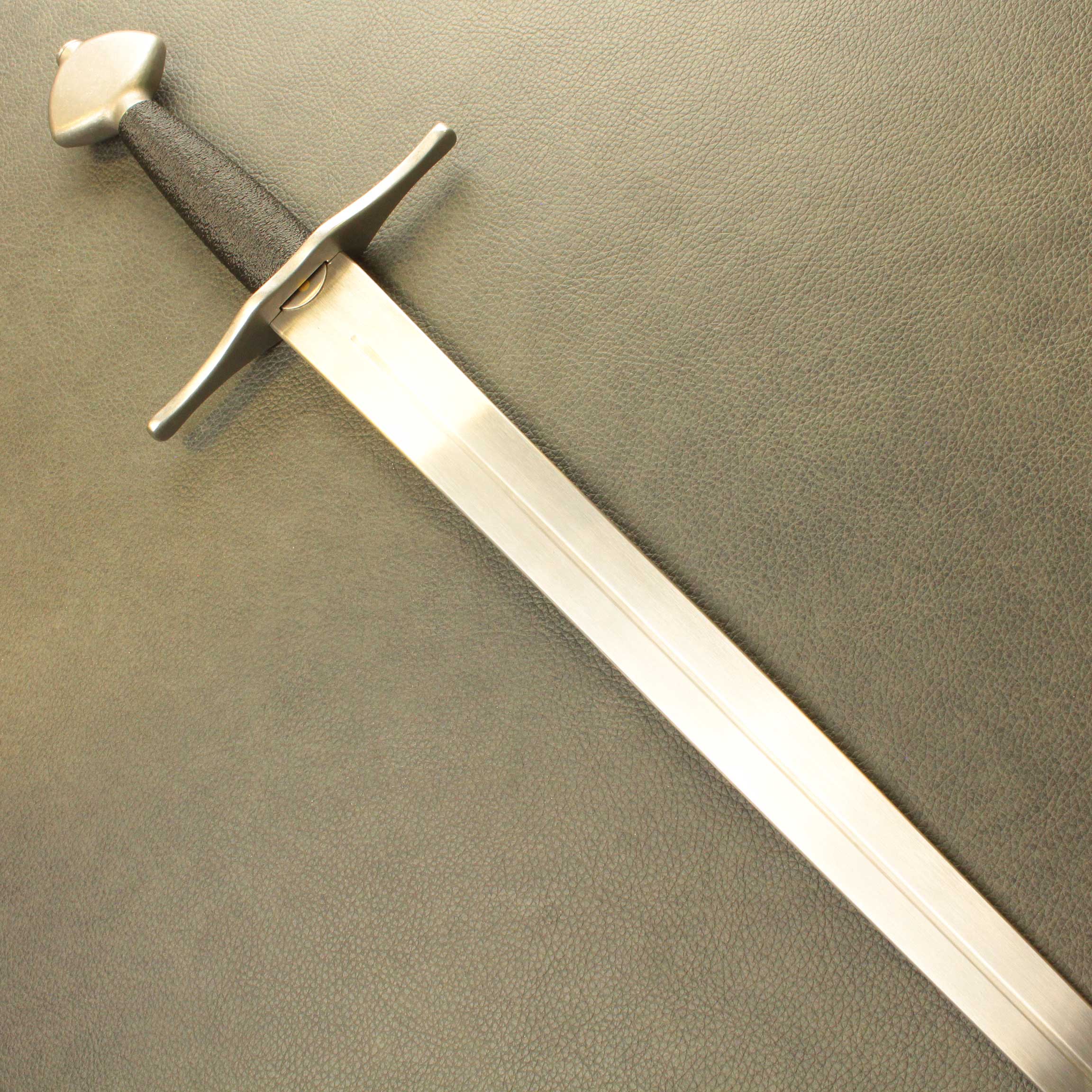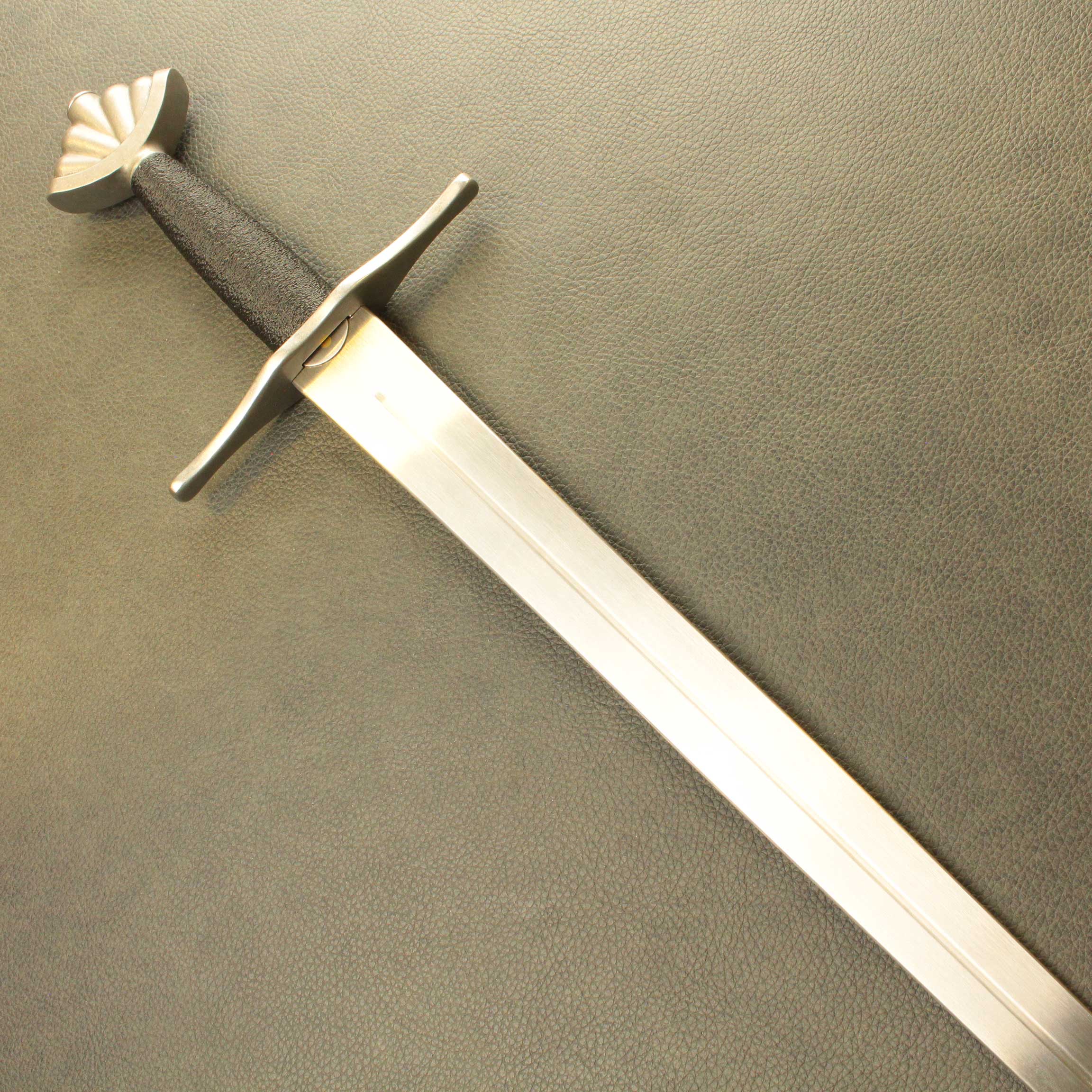In an effort to bring you the toughest, historically accurate safe sparring arming sword simulators, we went back to the drawing board. We started out by not just researching historical antiques from a new perspective, we handled them. We found most 13th and 14th century antiques were lighter than expected. Most fell into the 800 to 900 gram category with blades between 80cm and 88cm. We used this baseline to build this new line of arming sword simulators. These swords comes standard with our wide profile Broadsword blade (BBS Broadsword Blade), available in lengths of 32″, 34″ and 36″, a contoured 4.25″ (11cm) black PLA grip, and a choice of 3 iconic pommels. You can choose from these 3 profiles: the Wheel (Type J1), The Brazil Nut (Type A) and Migration era Type M style pommel, all made from solid stainless steel. these Pommels are all very close in weight so for consistency, they do not change the POB from one to the other.