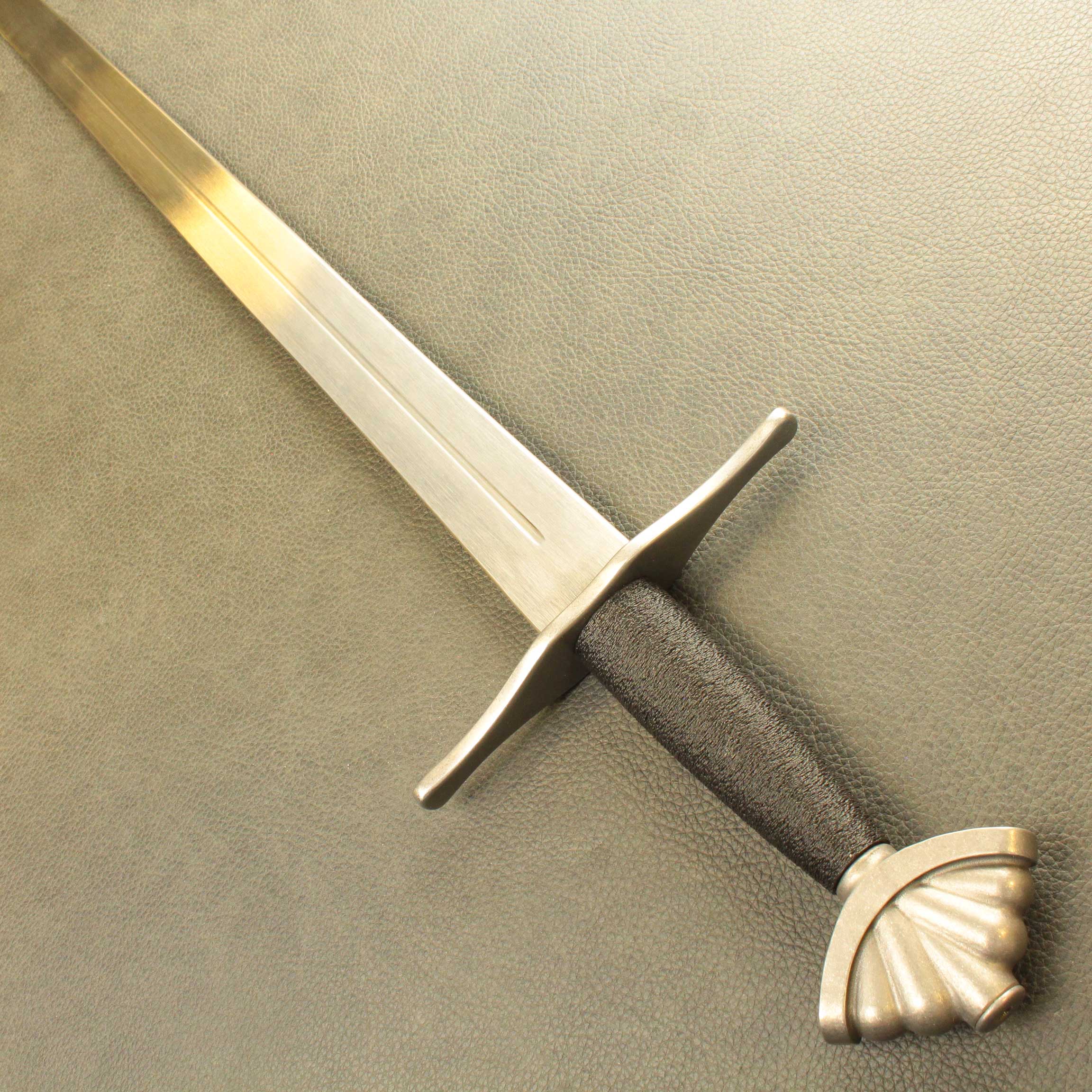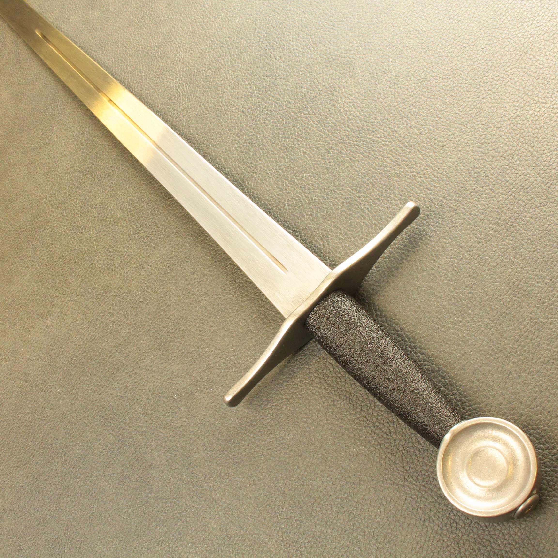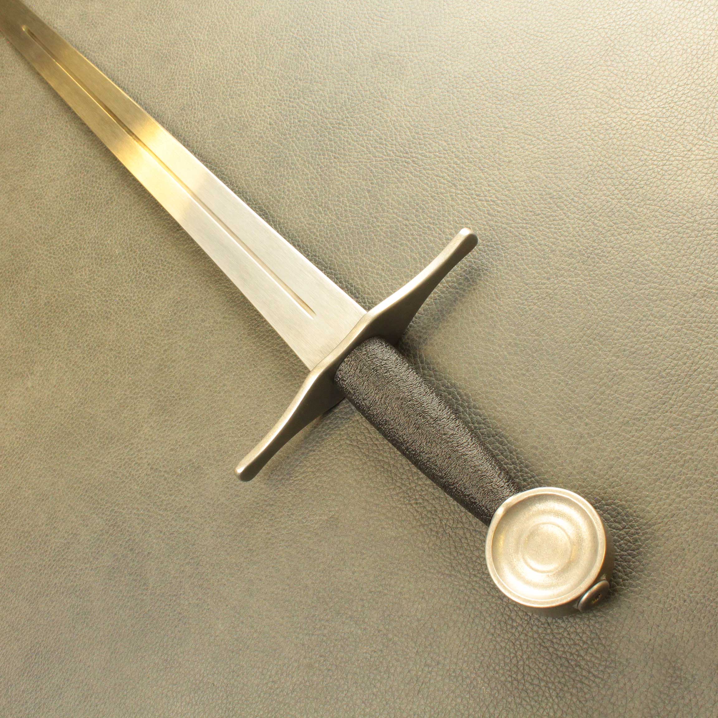 In an effort to bring you the toughest, historically accurate safe sparring arming sword simulators, we went back to the drawing board. We started out by not just researching historical antiques from a new perspective, we handled them. We found most 13th and 14th century antiques were lighter than expected. Most fell into the 800 to 900 gram category with blades between 80cm and 88cm. We used this baseline to build this new line of arming sword simulators. These swords comes standard with our wide profile Broadsword blade (BBS Broadsword Blade), available in lengths of 32″, 34″ and 36″, a contoured 4.25″ (11cm) black PLA grip, and a choice of 3 iconic pommels. You can choose from these 3 profiles: the Wheel (Type J1), The Brazil Nut (Type A) and Migration era Type M style pommel, all made from solid stainless steel. these Pommels are all very close in weight so for consistency, they do not change the POB from one to the other.