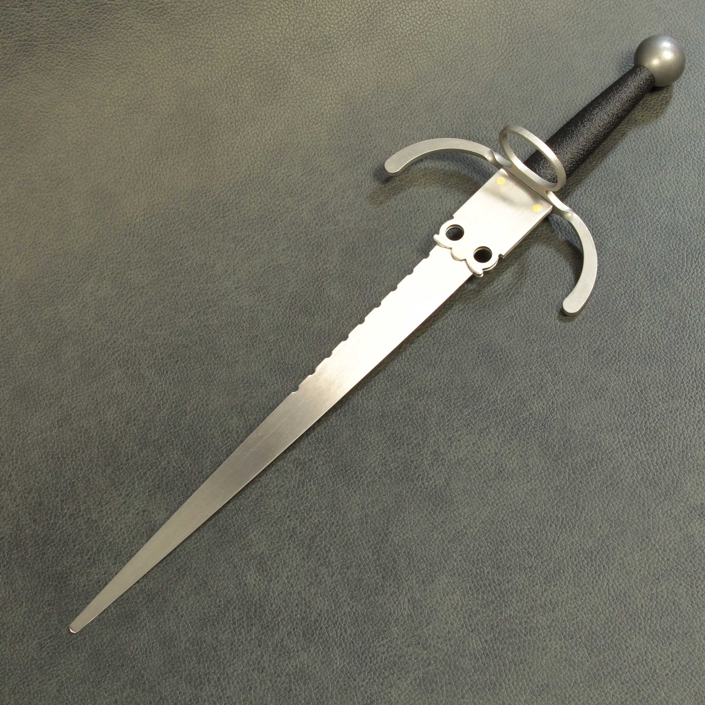 This Economy dagger features our Economy Single Ring dagger guard with curved quillons, Economy Dagger blade @ 12″ or 16″ or our Economy Main Gauche blade @ 16″,  black PLA handle, and small ball pommel.