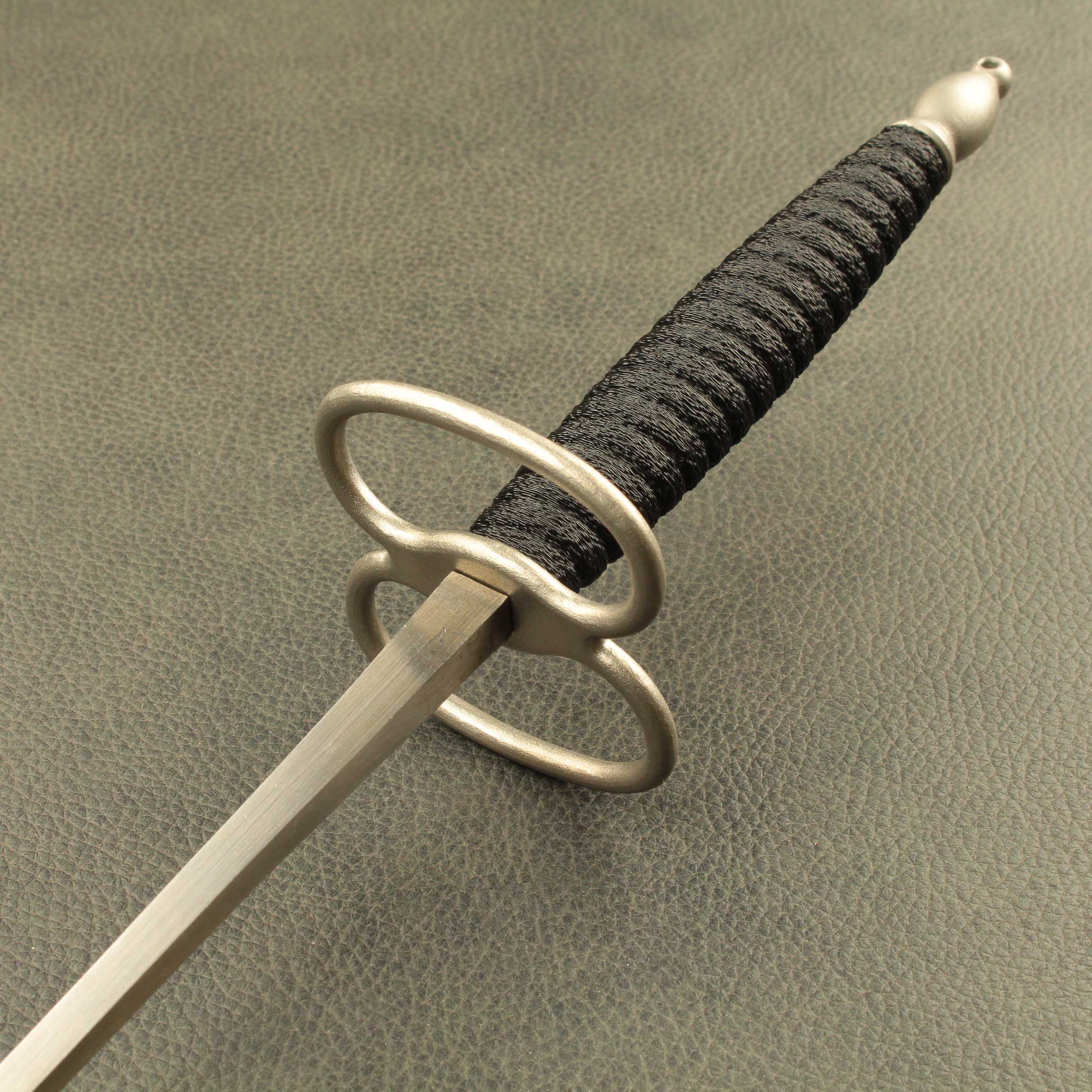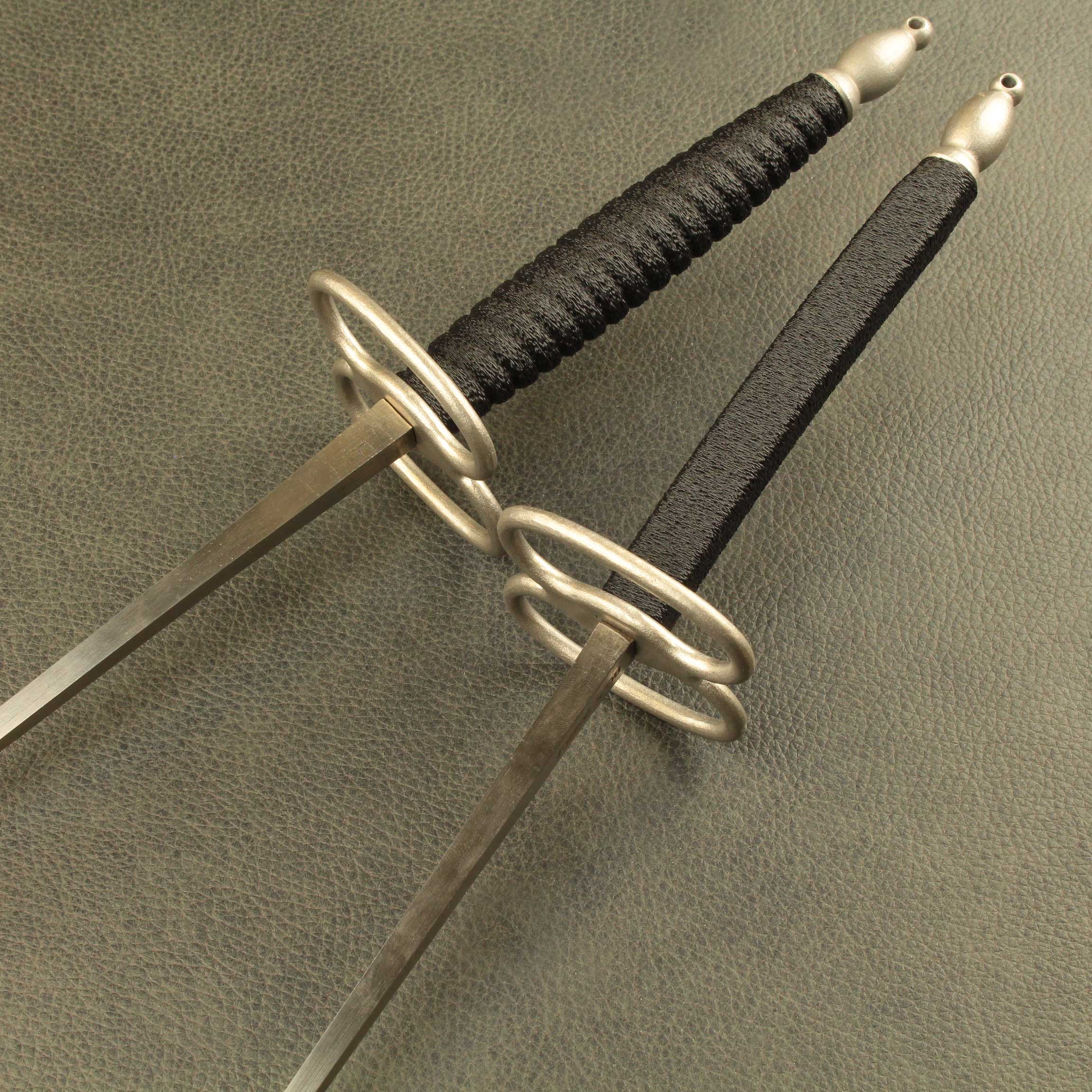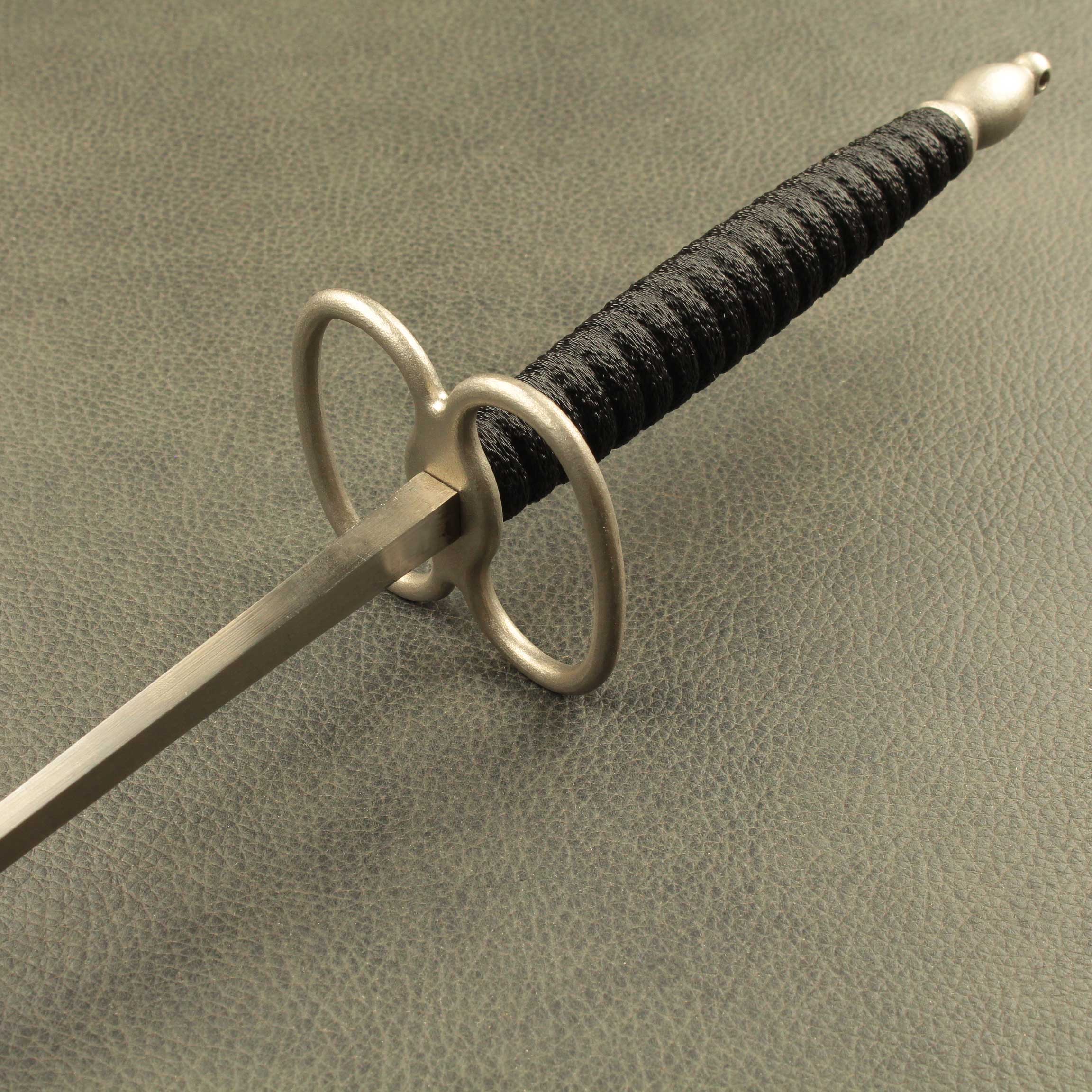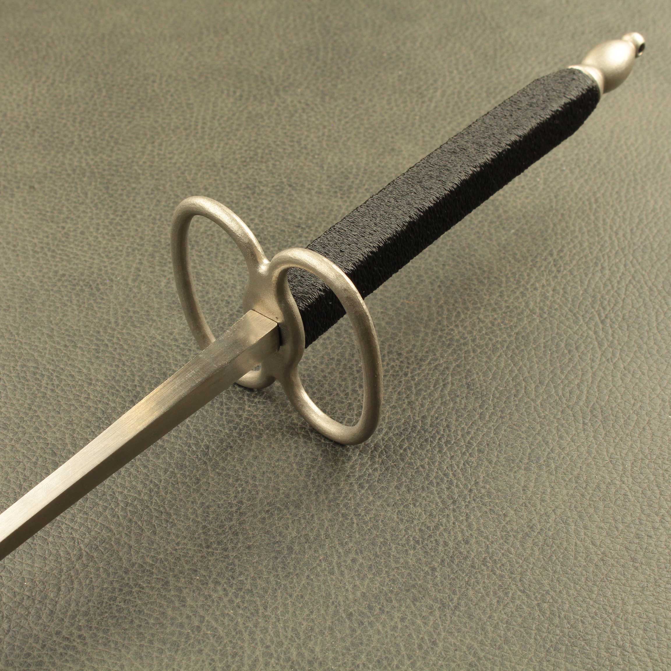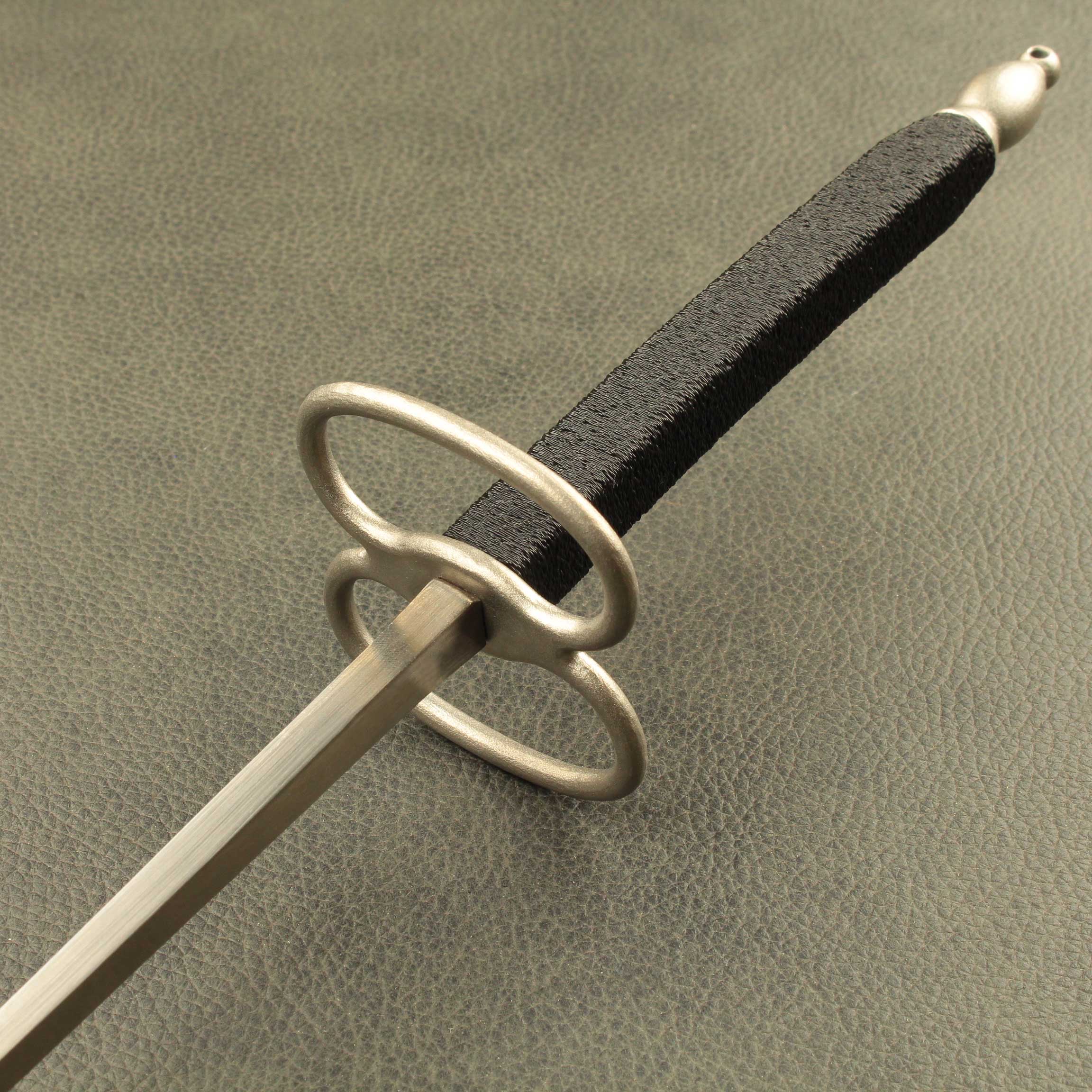 Mounted on a #5 foil blade with a choice of two grip styles, the total weight is a mere *280 grams(9.8oz) with a balance point of 11cm* (4.4″). The “Bishop” shaped pommel is 24 grams (.84oz), is tapped with M6 thread and has a small hole though the end that will accommodate a rod up to 1/8″ to help tighten everything down. The iconic figure eight “Lunette” guard is 54gr. The grip selections are both 12.6cm (5.0″) long per the antiques and average 34 grams (1.2oz) between the two styles. Style #1 is a contoured elliptical shape that tapers at each end and has a ribbed pattern that feels identical to the antique. Style #2 has a more commonly used square cross section with a slight curve to aid what many modern and post modern practitioners consider the “proper” grip.