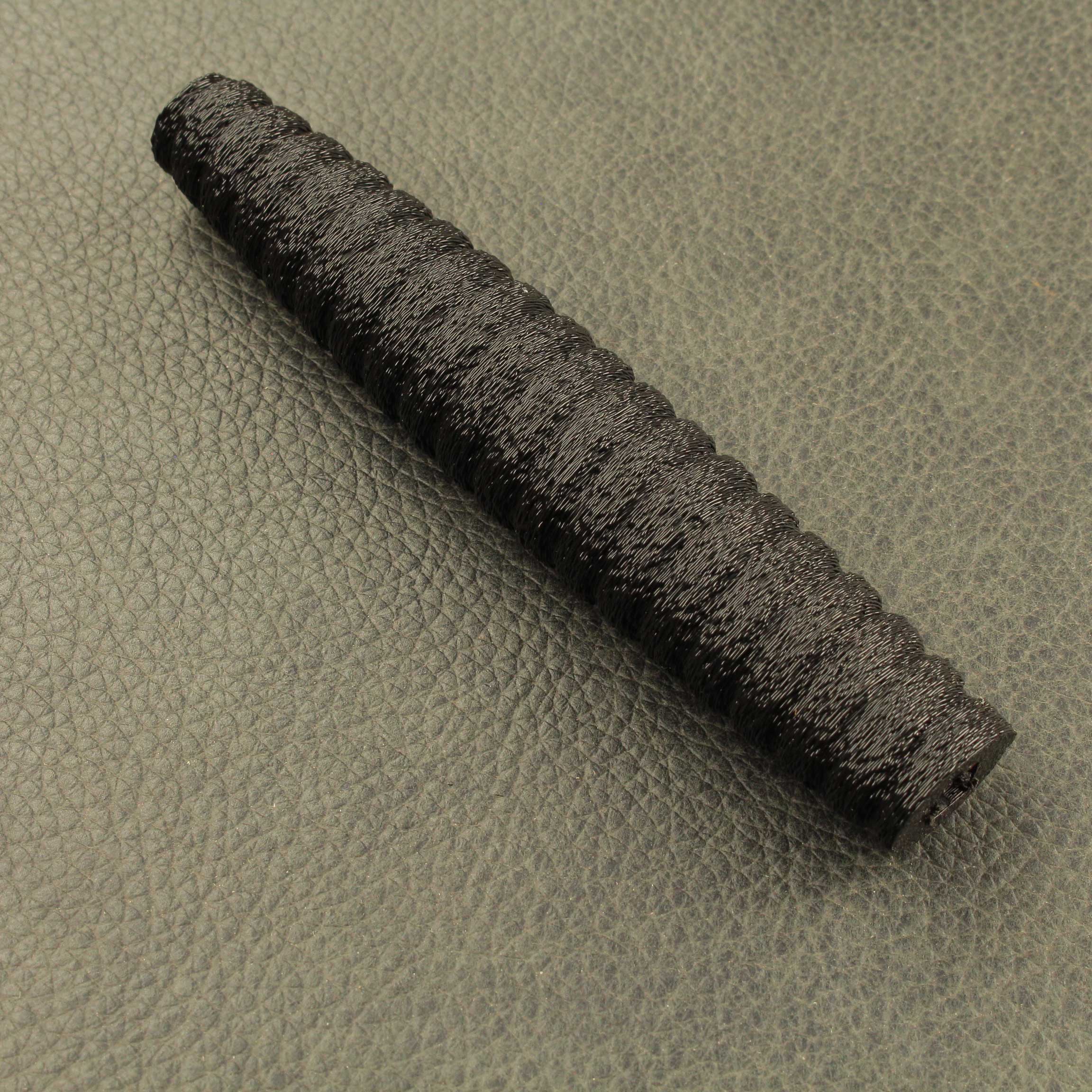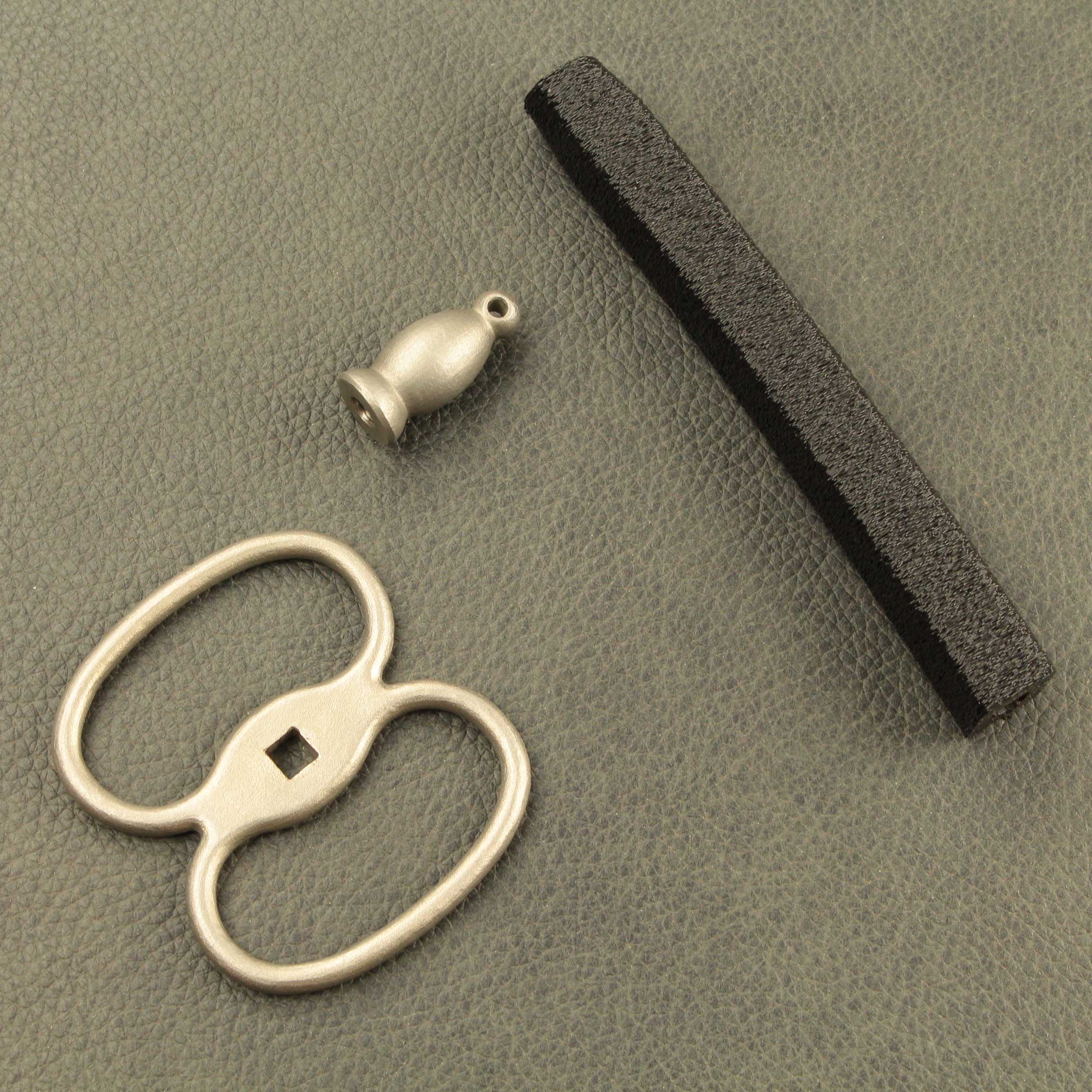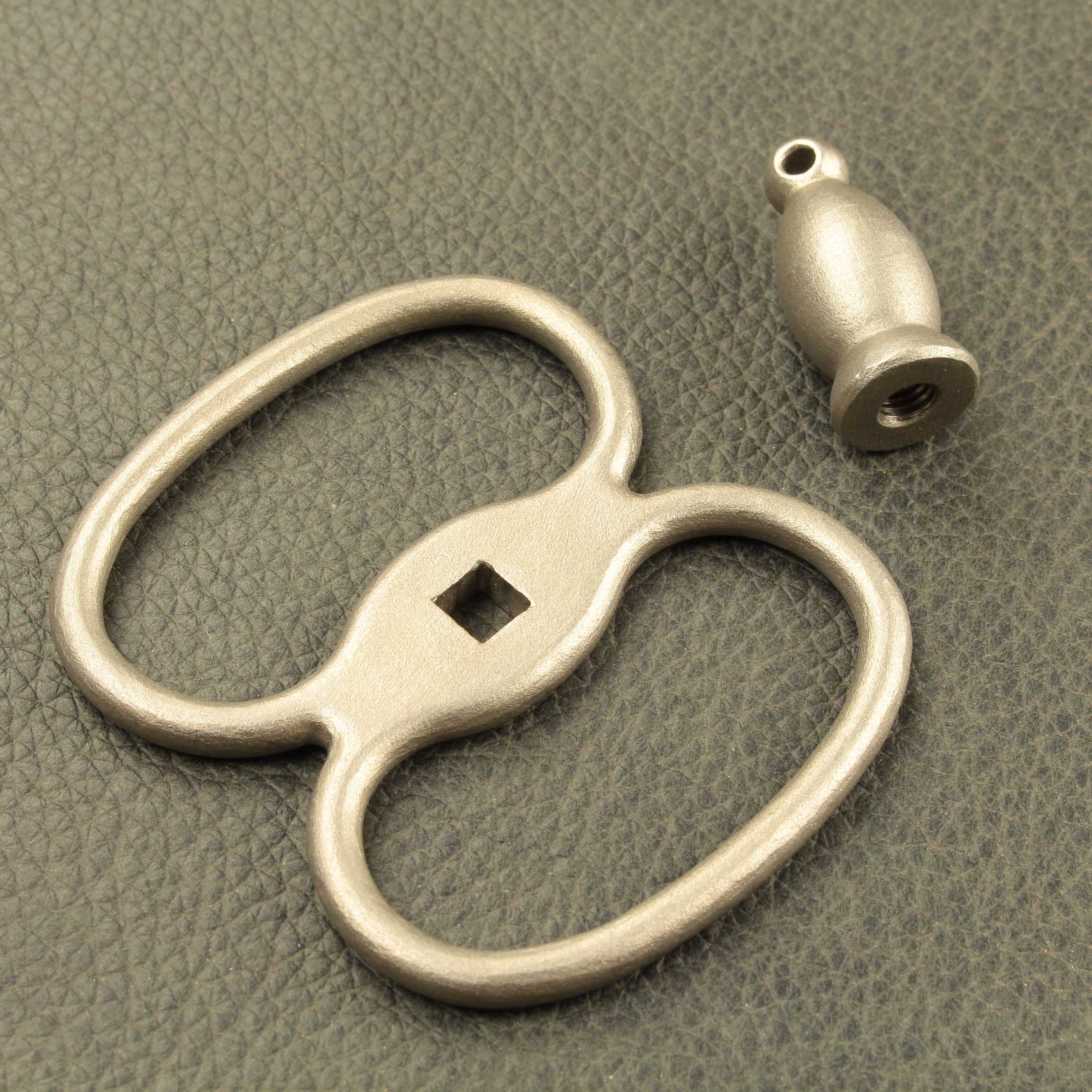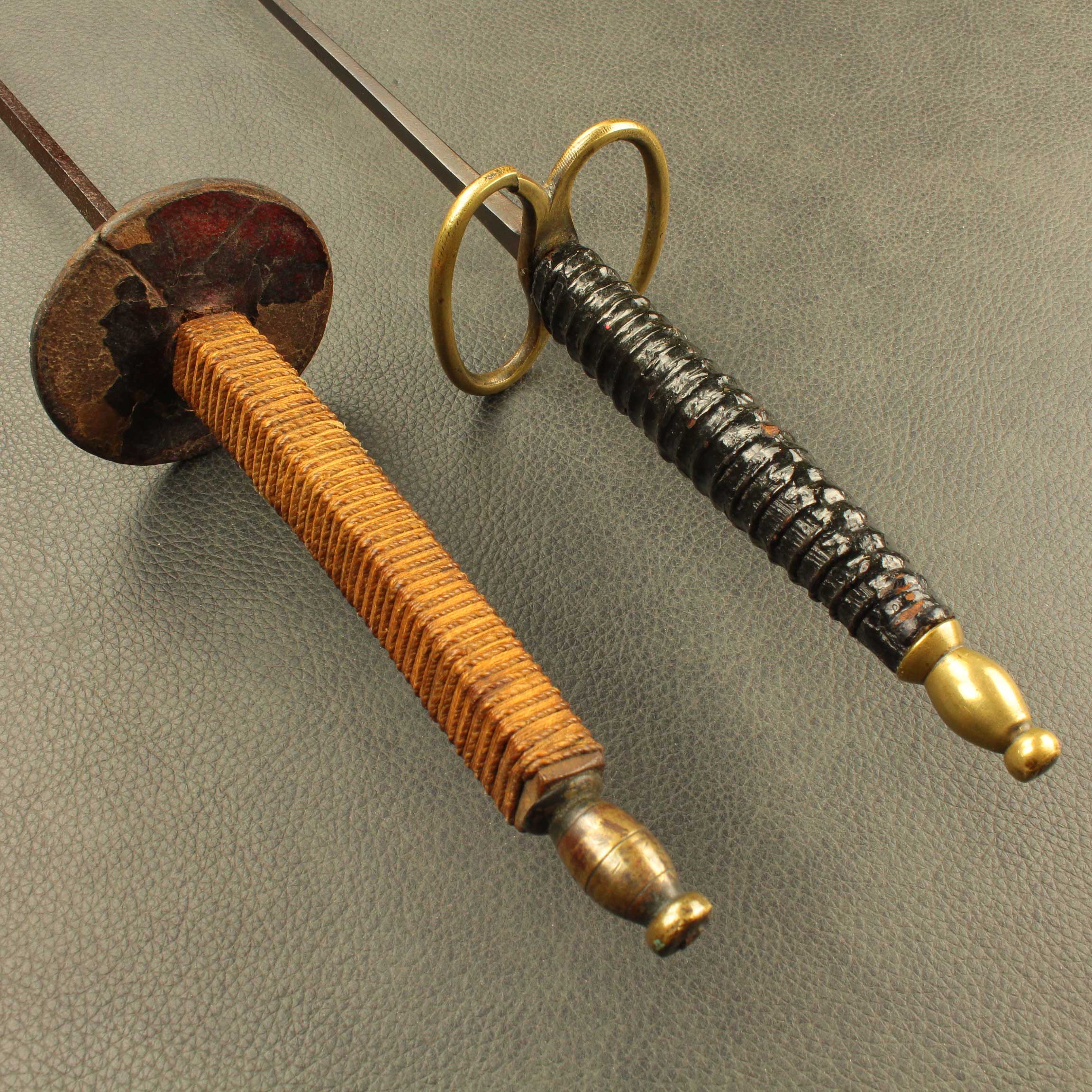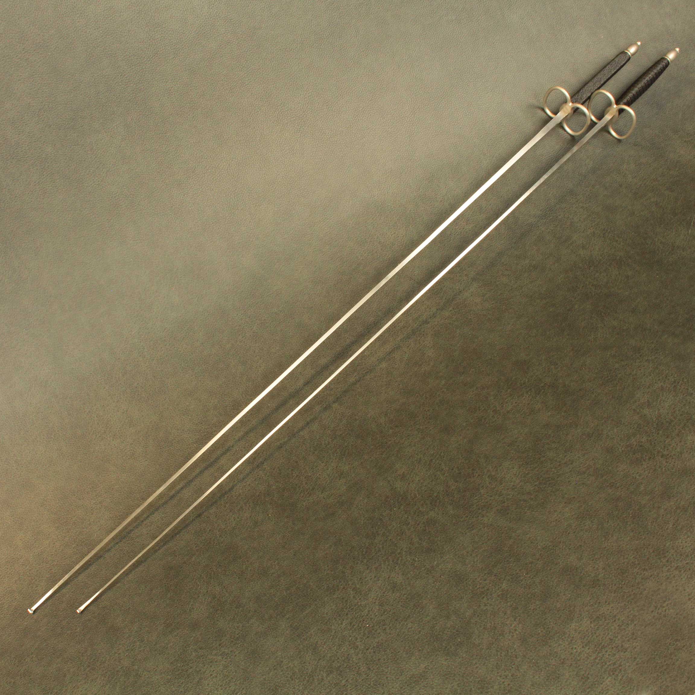 Mounted on a #5 foil blade with a choice of two grip styles, the total weight is a mere *280 grams(9.8oz) with a balance point of 11cm* (4.4″). The “Bishop” shaped pommel is 24 grams (.84oz), is tapped with M6 thread and has a small hole though the end that will accommodate a rod up to 1/8″ to help tighten everything down. The iconic figure eight “Lunette” guard is 54gr. The grip selections are both 12.6cm (5.0″) long per the antiques and average 34 grams (1.2oz) between the two styles. Style #1 is a contoured elliptical shape that tapers at each end and has a ribbed pattern that feels identical to the antique. Style #2 has a more commonly used square cross section with a slight curve to aid what many modern and post modern practitioners consider the “proper” grip.