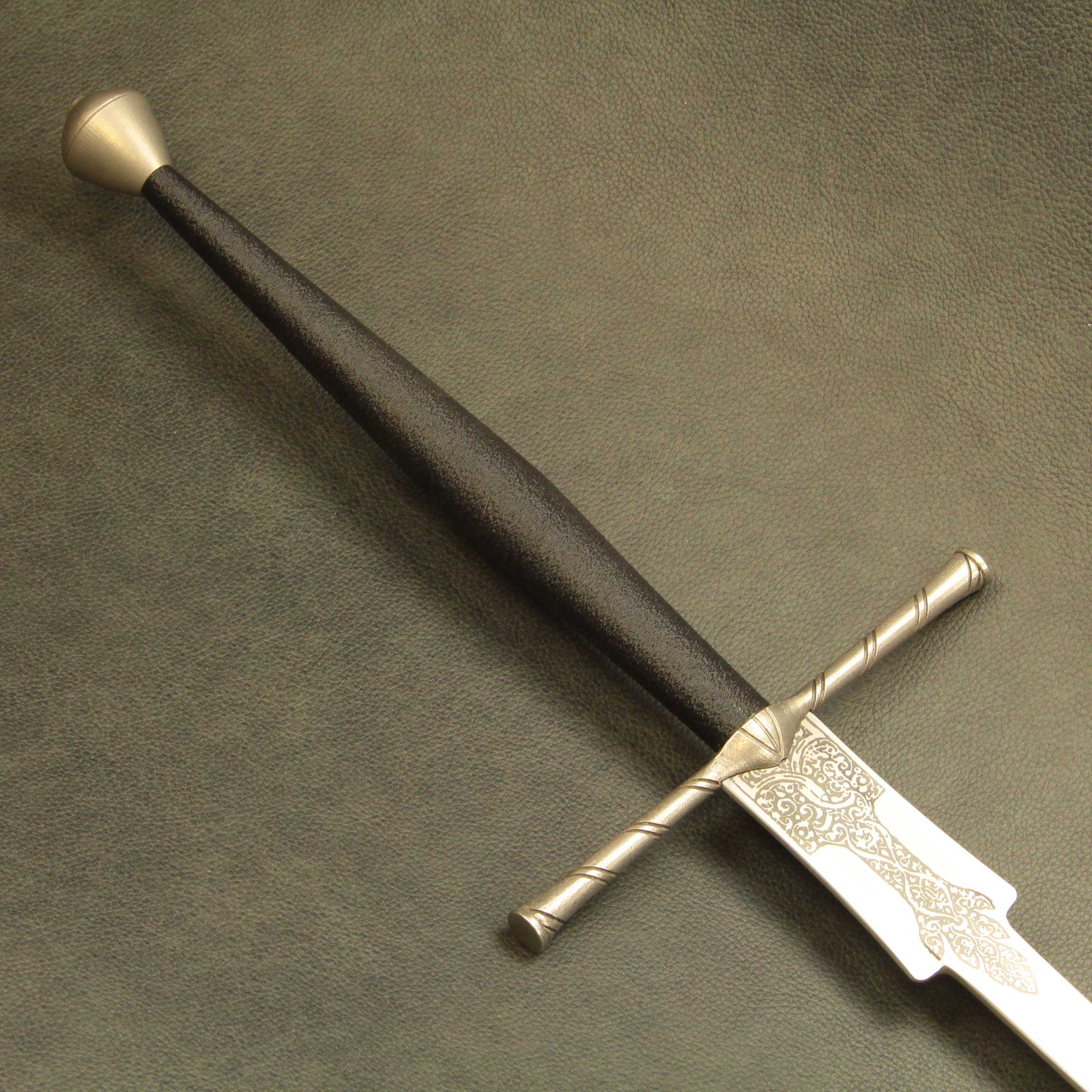 Ok! Blades! We offer 2 feder blade levels – a plain, low-cost version and a fancy version with the iconic engraving and schilt contours that represents the detail of the antiques that these swords pay homage to. These blades are both 38” (96.5cm) long from tang shoulder to tip. They feature a 4” (10.2cm) long schilt that is 2” (5.1cm) wide. For safe use for the modern practitioner, we decided to forego the true, nearly sharp spatulated tip that the antique has in favor of a modern conventional taper and swelled tip. The blade below the schilt tapers from 1/18” (28mm) wide to a swelled and rounded 5mm thick tip, 7/16” (12mm) wide. These blades are flat distal tapered and have a rounded edge thickness from 5mm to 3mm at the thinnest point.