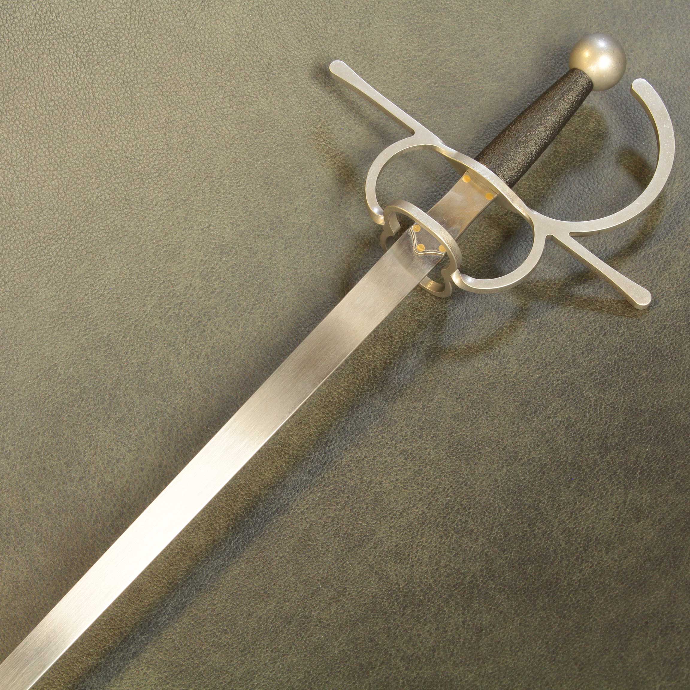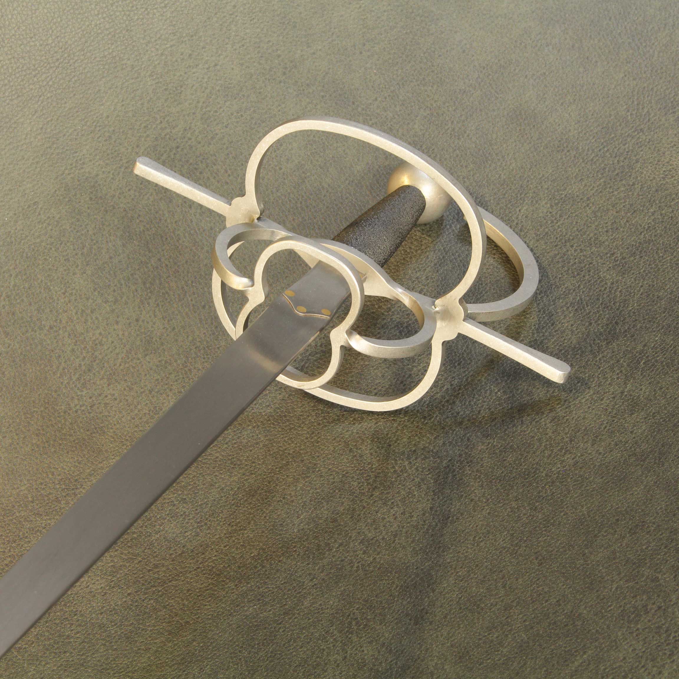 The guard is a traditional build with ample hand protection that can fit a large glove, consisting of front ports OR front ports and full rings over the knuckles, straight quillons and a stout knuckle bow.